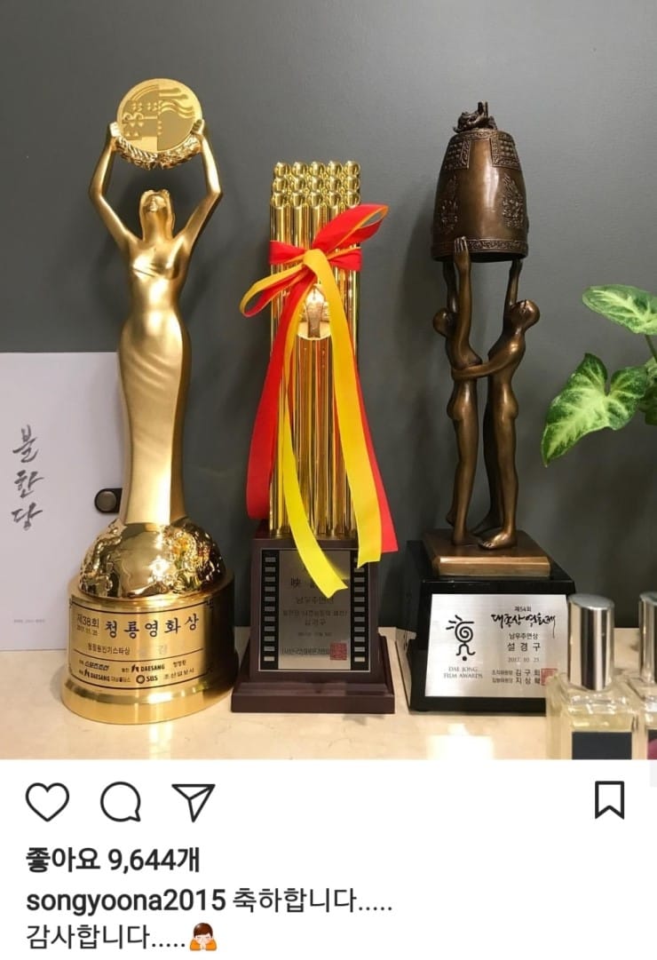 2000년에 박하사탕으로, 2002년에 오아시스로 수상했던 이래 15년 만에 다시 받아든 영평상 트로피를 저리도 애틋하게 바라보다니... 짠혀...ㅠㅠㅠ