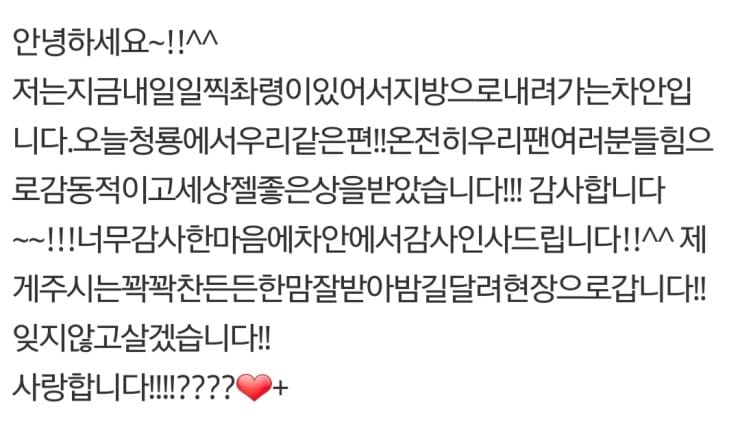 영화제 끝나자마자 빛의 속도로 집에 트로피 갖다 놓고 지방 촬영 내려가는 중에 팬들한테 '여러분 힘으로 세상에서 제일 좋은 상 받았다'고 글 써준 거 봐아............... 흑흑............. 세상에서 제일 좋은 상이래... 어쩜 말도 저렇게 예쁘게... 흑흑... 아조씨 사랑해요ㅠㅠㅠㅠㅠㅠㅠㅠㅠㅠㅠㅠㅠㅠㅠㅠㅠㅠㅠ