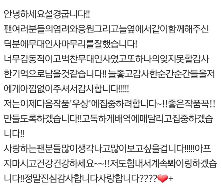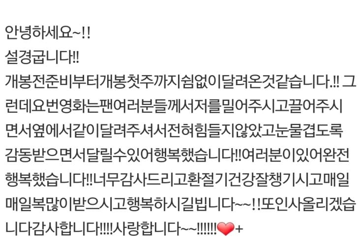 이틀 무대인사 도느라 고생했으니 이젠 자기 일상 살고 일하러 갔겄지 했던 설저씨가 수없이 많은 인증 사진을 챙겨들고 나타나서 팬카페와 갤에 인사를 남기고 갔다. 보통 연예인들이 자기 팬카페만 챙기고 갤은 잘 안 챙기는 사람들이 있는데 설저씨는 꼬박꼬박 양쪽 다 케어해줘서, 팬카페처럼 등업있는 폐쇄적인 공간을 선호하지 않는 나 같은 인간은 그저 고맙다. 흑흐규ㅠㅠㅠㅠ